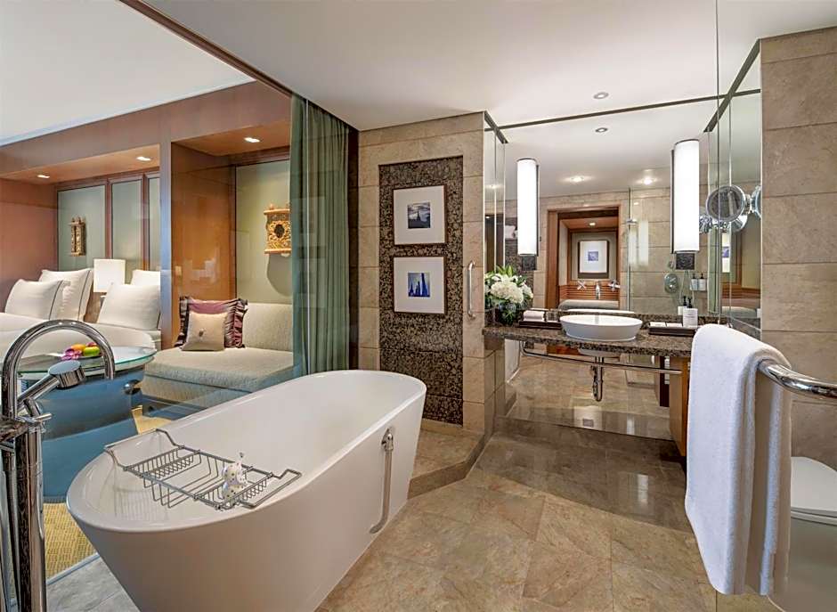 Spacious suite with a separate living room and a window with views of city skyline. Bathroom features a freestanding bathtub and a separate shower. The suite also comes with the Executive Lounge access.